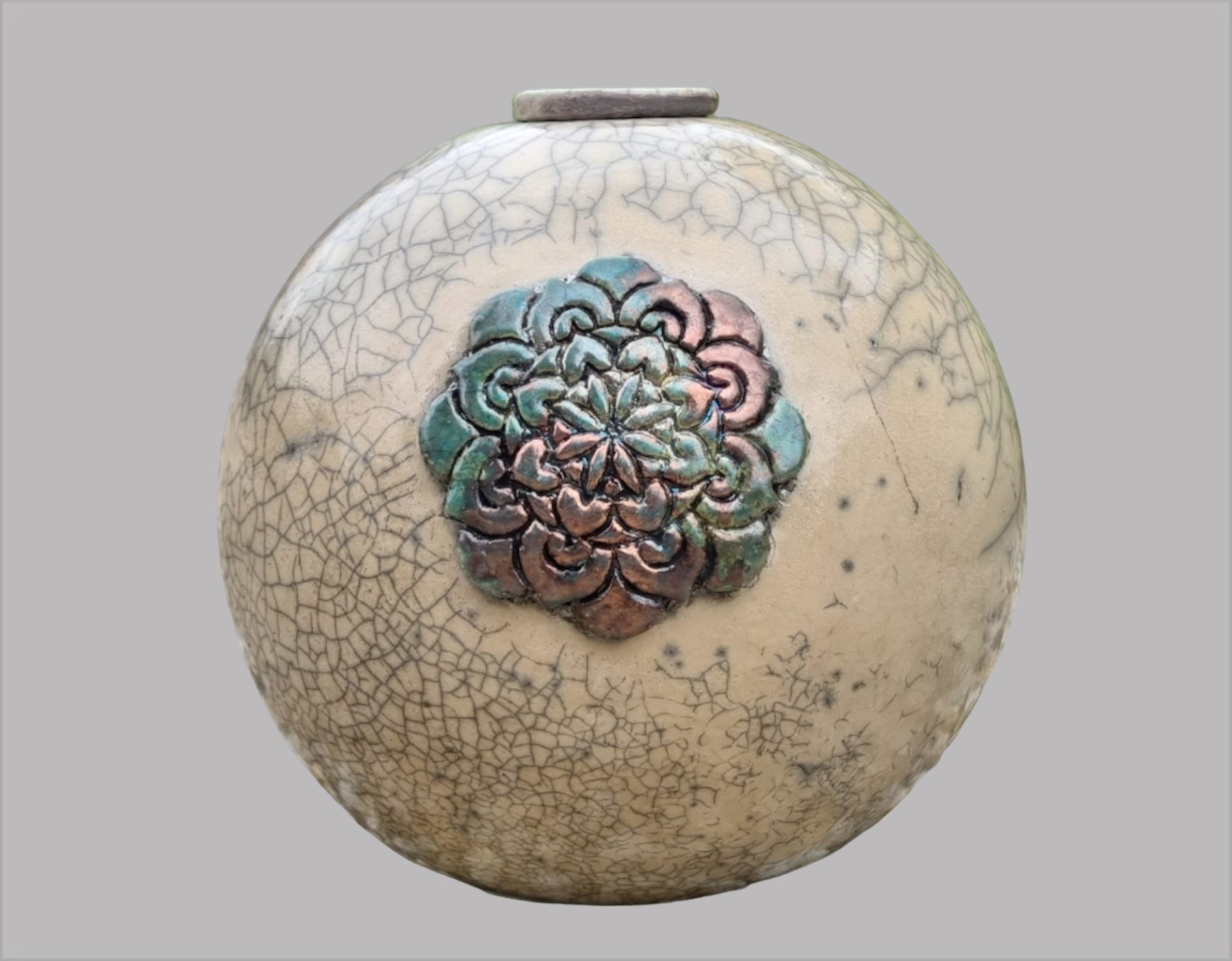 Een bol urn van keramiek met op de voorzijde een mandala. De mandala is turkoois/koper van kleur. De urn wordt met veel liefde en aandacht, handmatig vervaardigd. Door het speciale stookproces ontstaat er een craquelé structuur. Hierdoor heeft iedere urn zijn eigen unieke uitstraling. U ontvangt een vergelijkbare keramische urn, echter hebben wij geen invloed op de mate en structuur van de craquelé. De combinatie van kleur en en het craquelé maakt deze bol urn van keramiek een waar kunstobject, met iedere een eigen karakter.