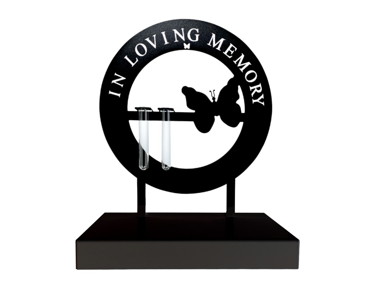 Vlinder urn “In loving memory” is een urn met een as-ruimte tot 1.8L. Deze urn is geheel van metaal gemaakt. De metalen plateau sokkel is tevens de as-ruimte. De sokkel is als het ware een metalen doos, waarin de as-zak bewaard wordt. Deze urn kunt u geheel naar eigen inzicht aanpassen, u kunt rekening houden met smaak overledene, trend, interieur. Als voorbeeld op de afbeelding ziet u de trend van dit moment namelijk de droogbloemen. Maar in de vaasjes past heel goed het favoriete bloemetje van de overledene. Ook met fotolijstje, mini urn, kaarsje kun je het gedenkobject geheel naar eigen wens maken. Aan het kleine vlindertje in het midden kun je b.v. een trouwring hangen.